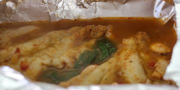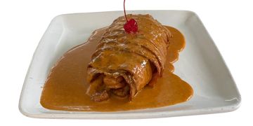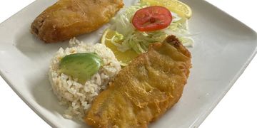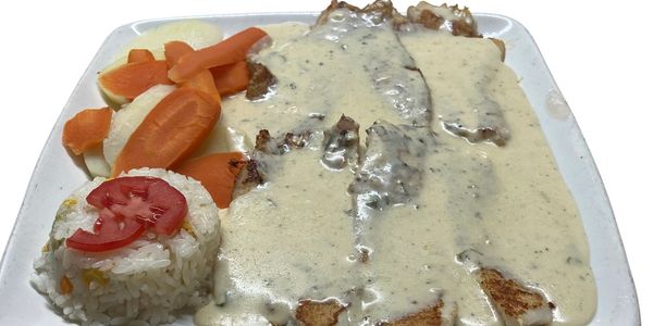 Filete en salsa de queso philadelphia, parmesano y doble crema, acompañado de arroz y verduras al vapor.