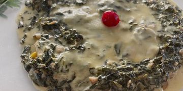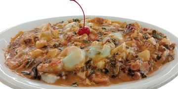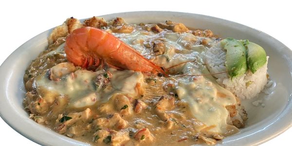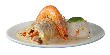 Filete en crema de champiñones con o sin mariscos, servidos con camarón para pelar.